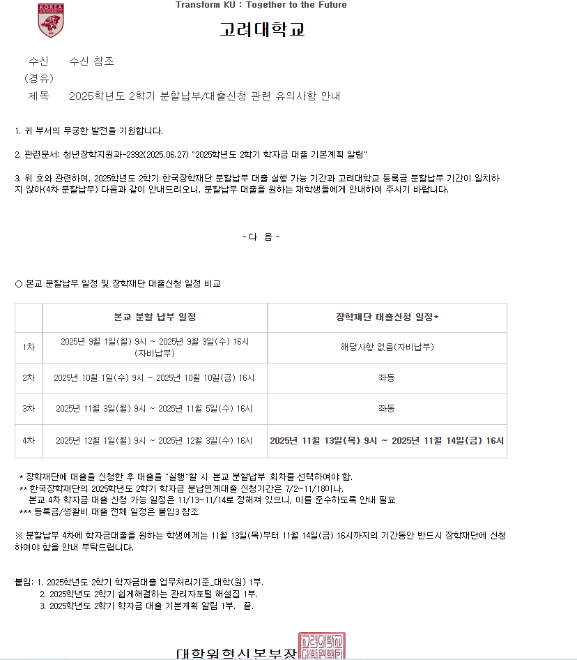 | 제목 | [대학원행정팀] 2025학년도 2학기 분할납부/대출신청 관련 유의사항 안내 |
